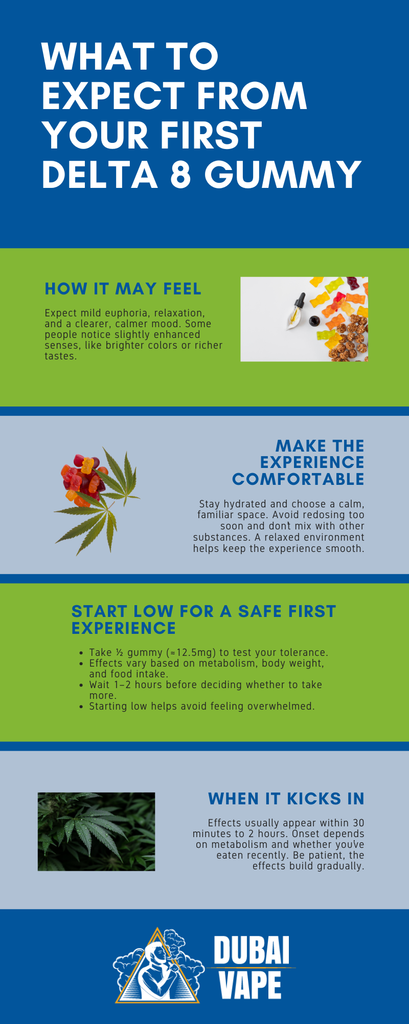 A first experience with a Delta 8 gummy often feels gentle yet noticeable. Most users report mild euphoria, calm focus, or ease in body tension. Effects can appear within one to two hours and last several hours, depending on dose and individual factors.